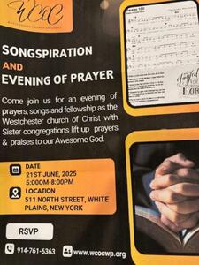 The Westchester church of Christ is hosting SONGSPIRATION and an EVENING OF PRAYER on June 21st 5:00-8:00 p.m. Please RSVP if you are able to attend.