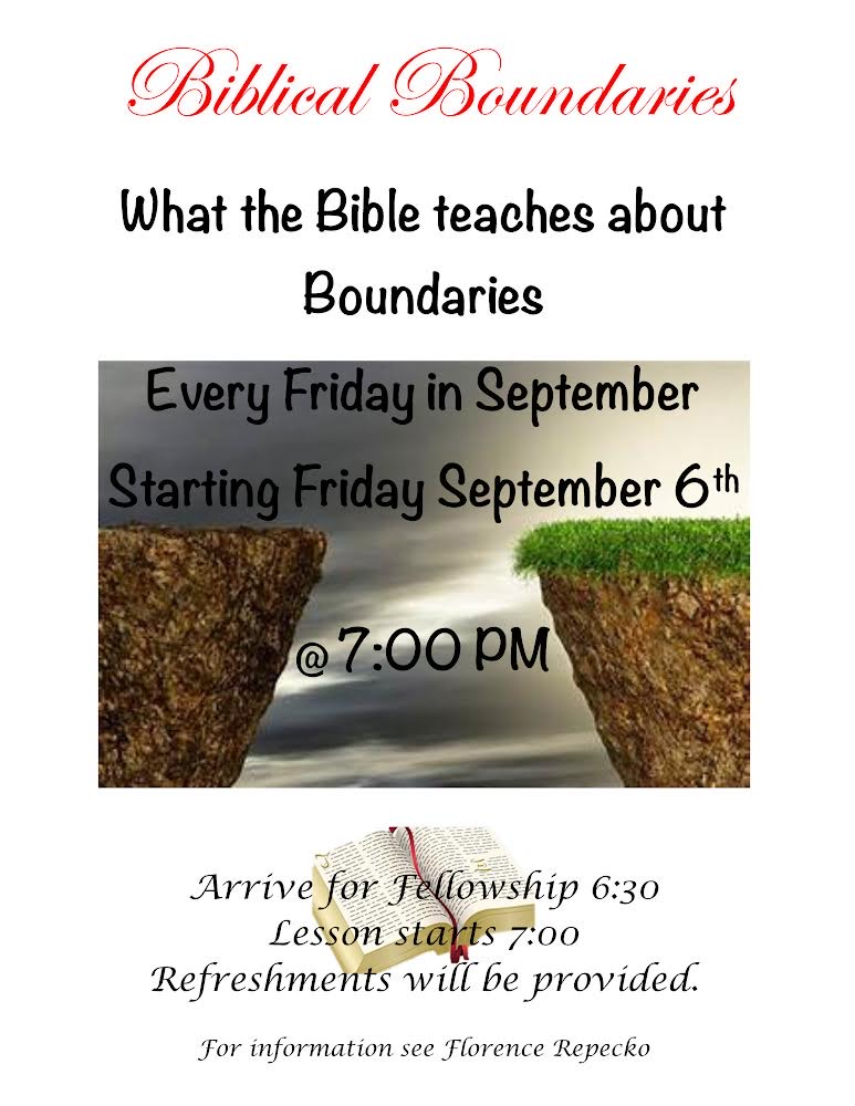 Biblical Boundaries Class By patrickkeller | September 5, 2024 - 10:12 am |September 5, 2024 Uncategorized Bookmark the permalink.