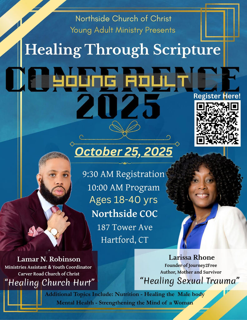 AREA EVENTS COMING UP: On October 25th 9:30 am The Northside Church of Christ Young Adult Ministry is hosting a conference on “Healing Through Scripture” for young adults. See below flyer for more info.